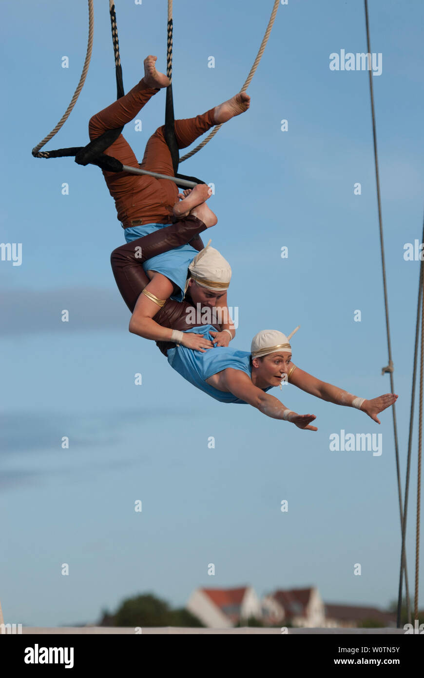 Two Acrobats Hang Overhead On A Swing Which Is Fixed Between The Masts They Hold Each Other Take Momentum On 30 07 2018 In Flensburg Harbour Inner Harbour On The Traditional Sailing Ship Lovis